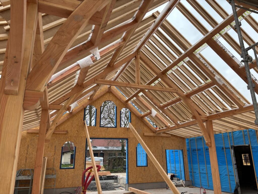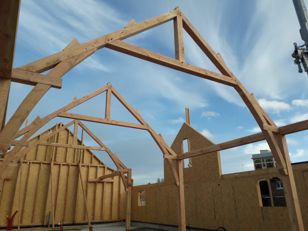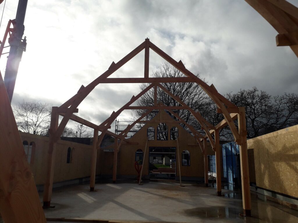 L’ossature bois s’élève petit à petit, on voit apparaitre l’oratoire de l’infirmerie :
